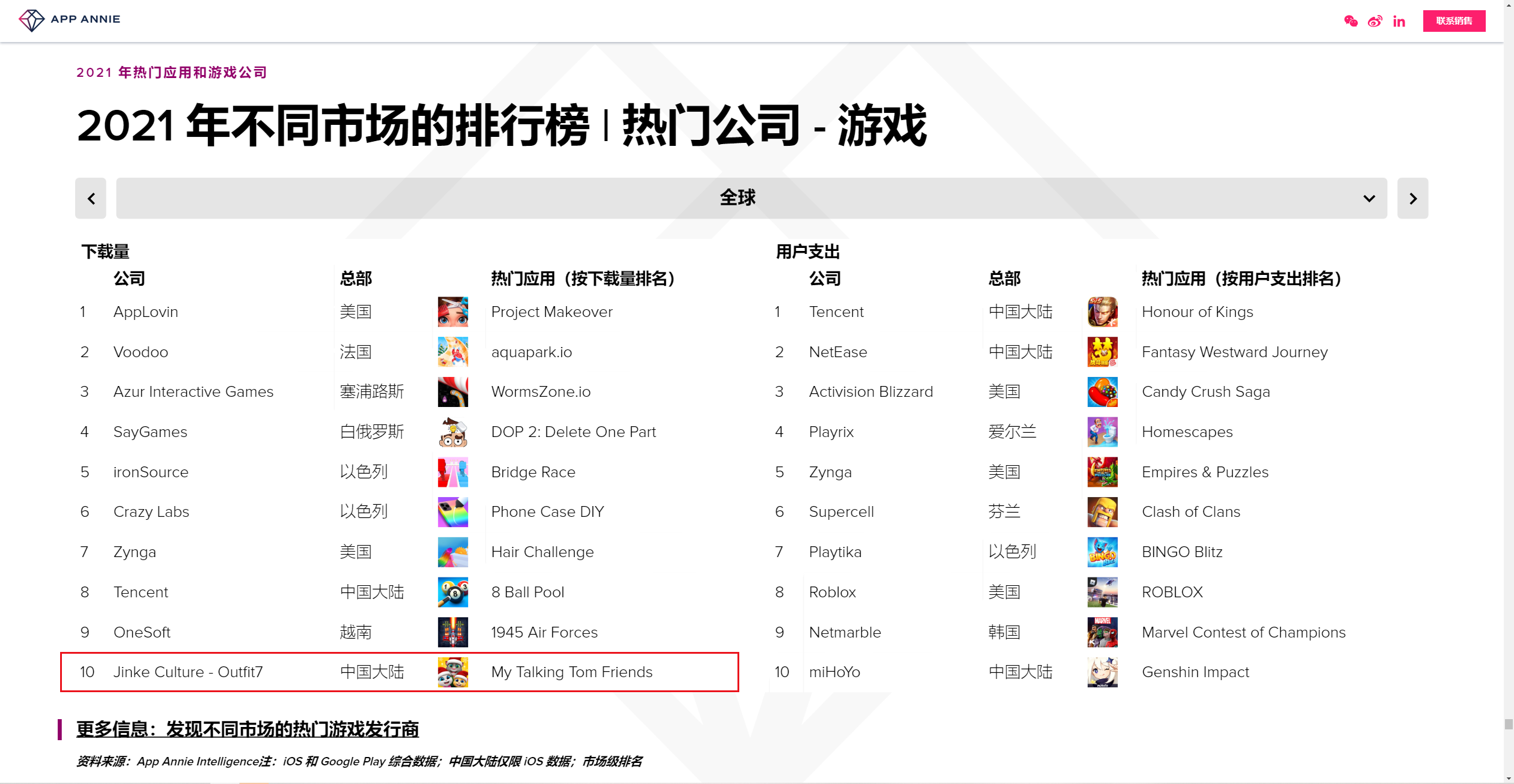 作为全球顶尖的移动应用开发商及IAA(In-App Advertising)游戏领域的市场领导者,2021年IM电竞持续表现优异。《2022年移动市场报告》数据显示,IM电竞凭借旗下“会说话的汤姆猫家族”IP系列移动应用的卓越表现,再度蝉联2021年iOS及Google Play游戏综合下载榜全球前十,成为2021年全球热门游戏公司里仅有的两家中国公司之一。同时,在中国、俄罗斯、印度、巴西、阿根廷、哥伦比亚、马来西亚、新加坡等全球15个国家,IM电竞也均保持着前十的综合实力。